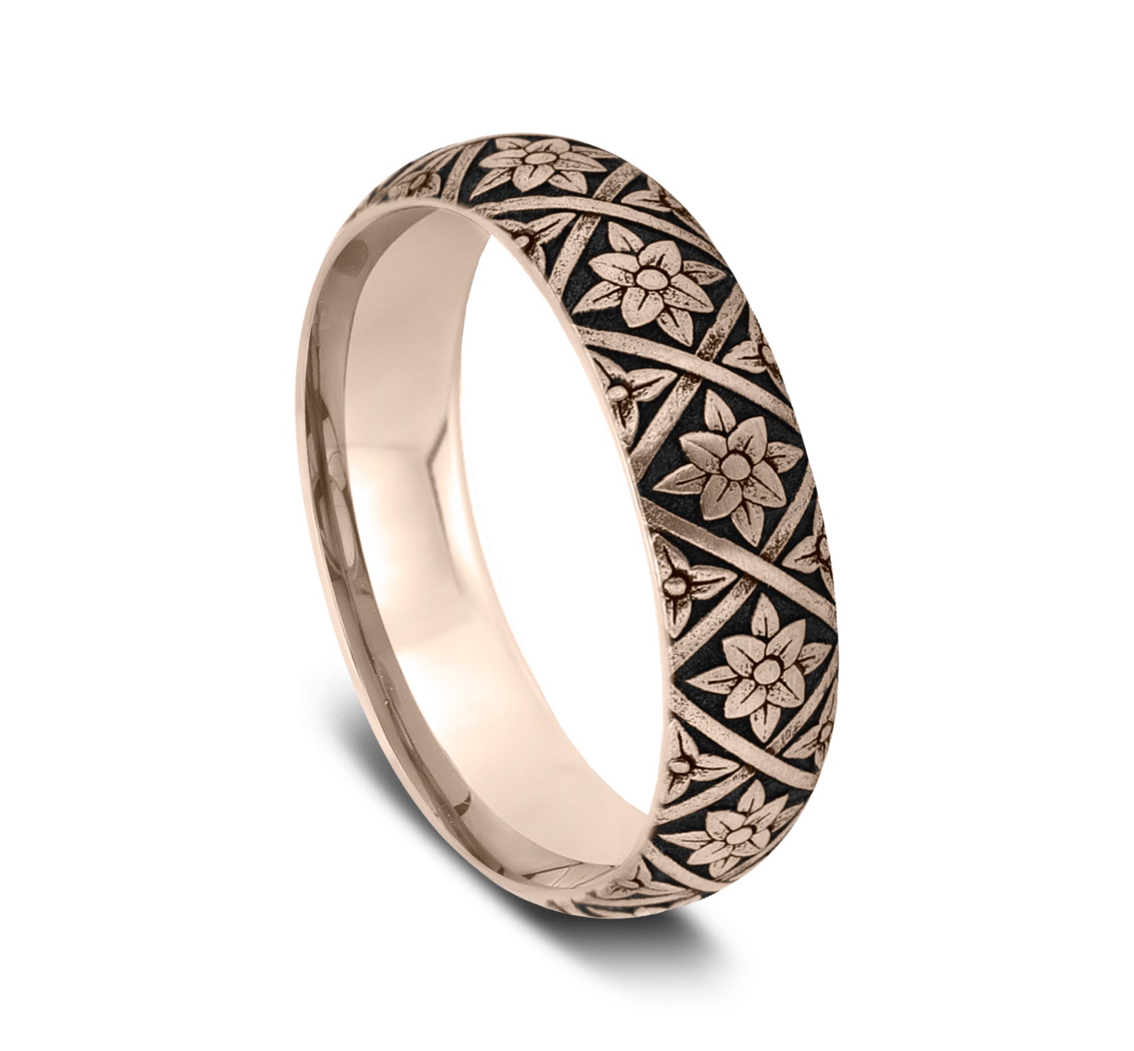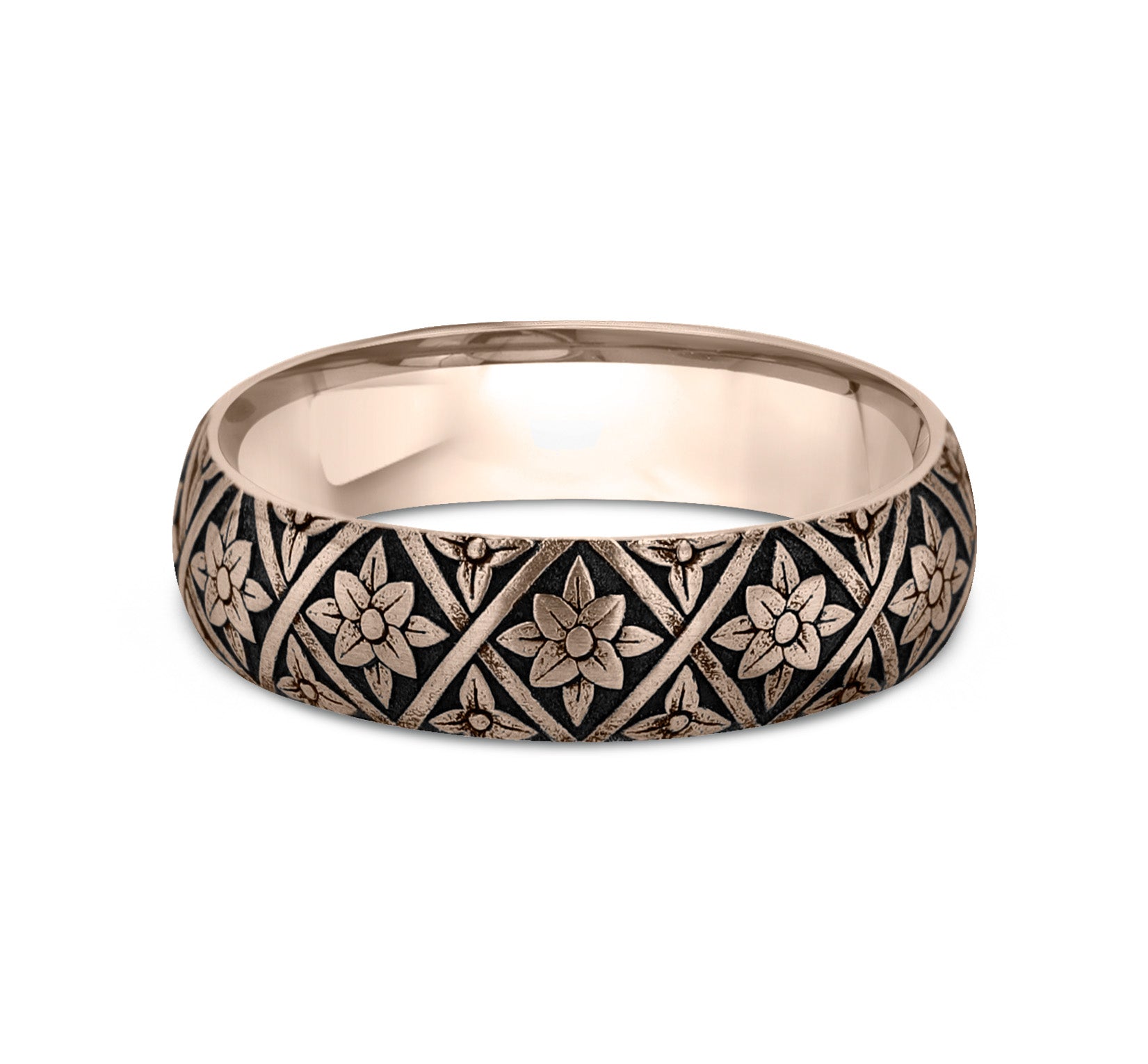 6.5mm, Comfort fit 14K Yellow Gold Floral weave designed center, gear edges