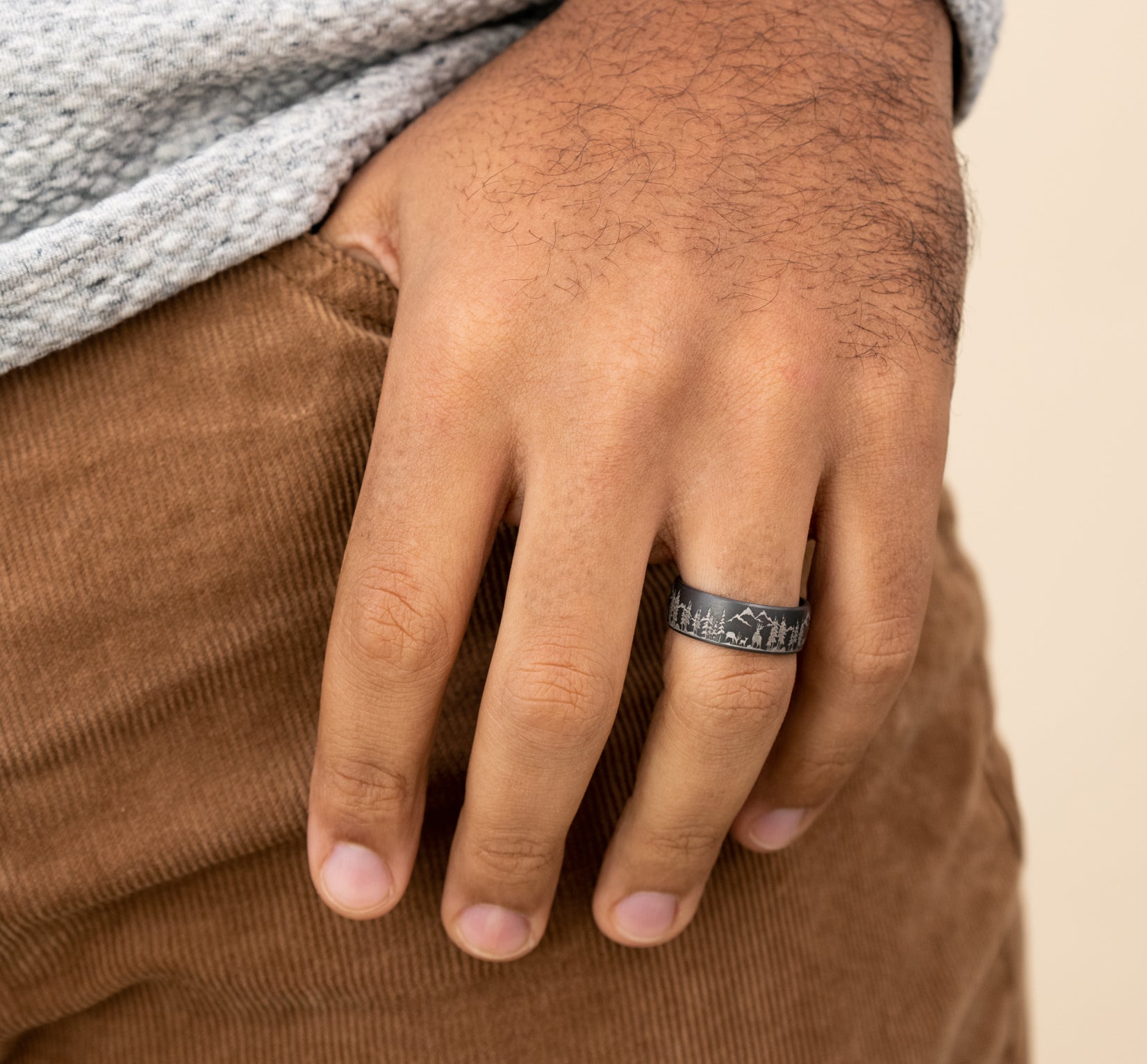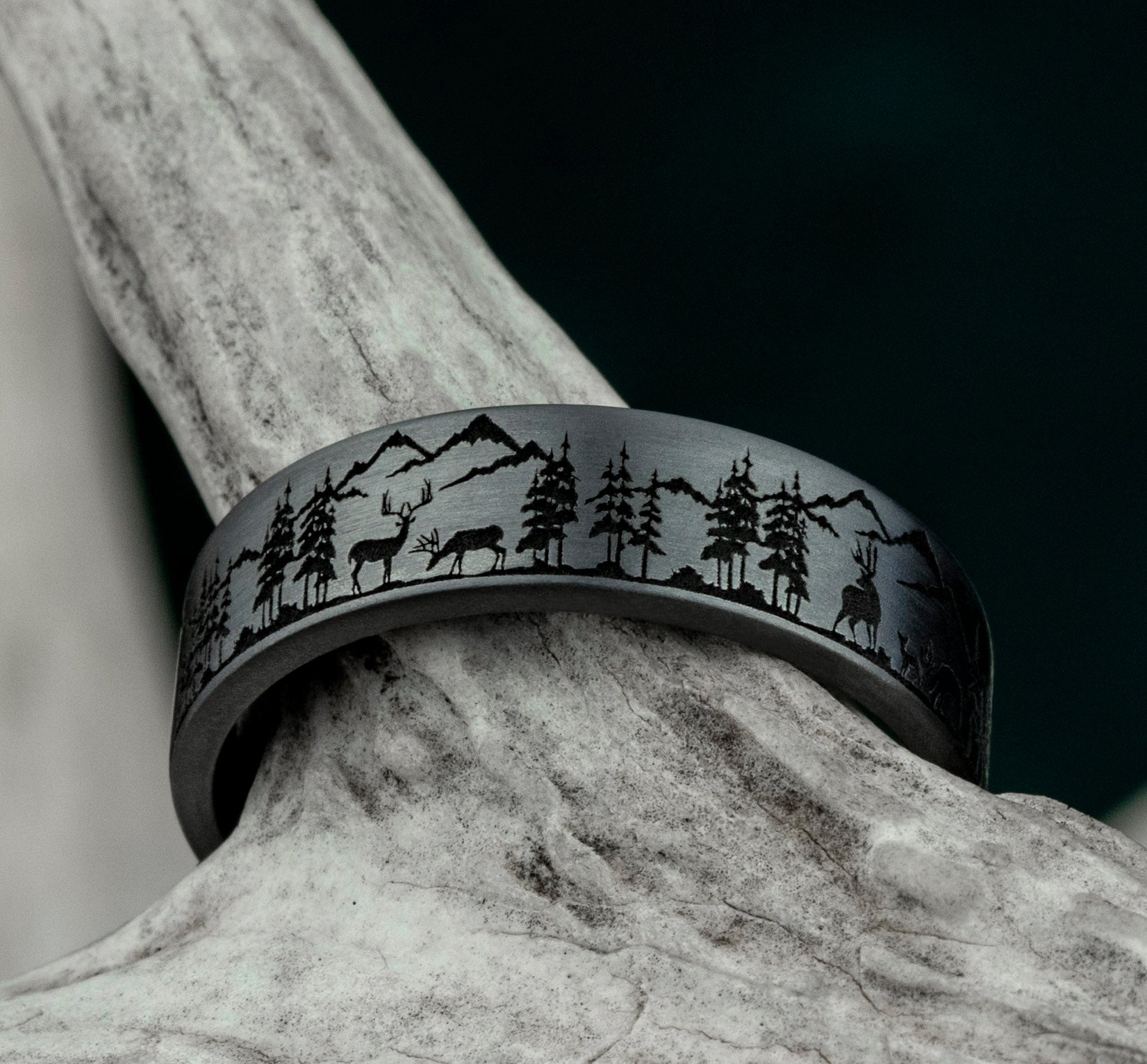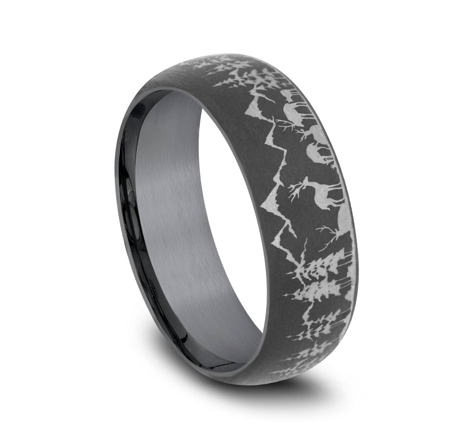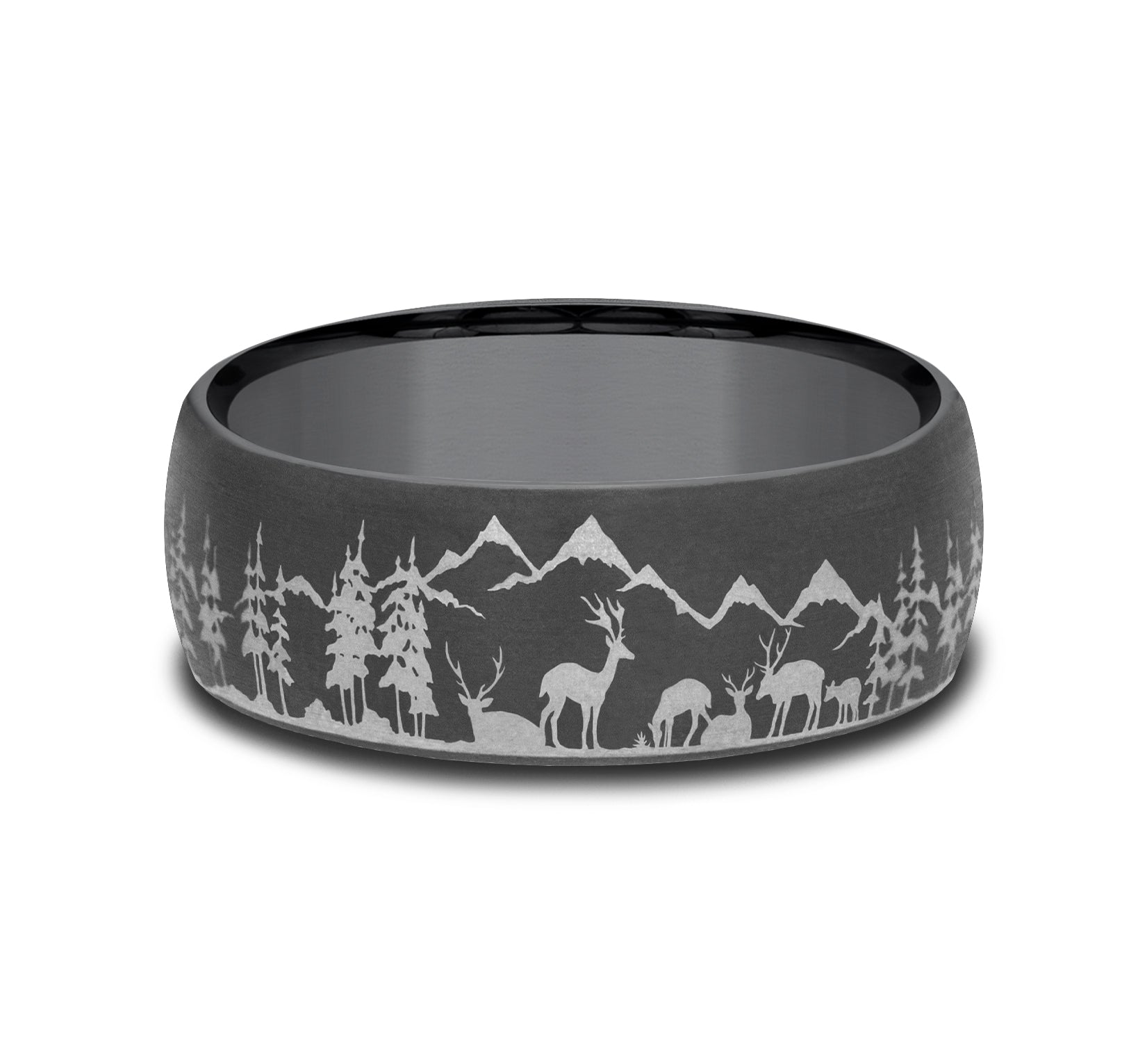 7mm, Comfort fit Grey Tantalum Nature scene with mountains, deer, and trees