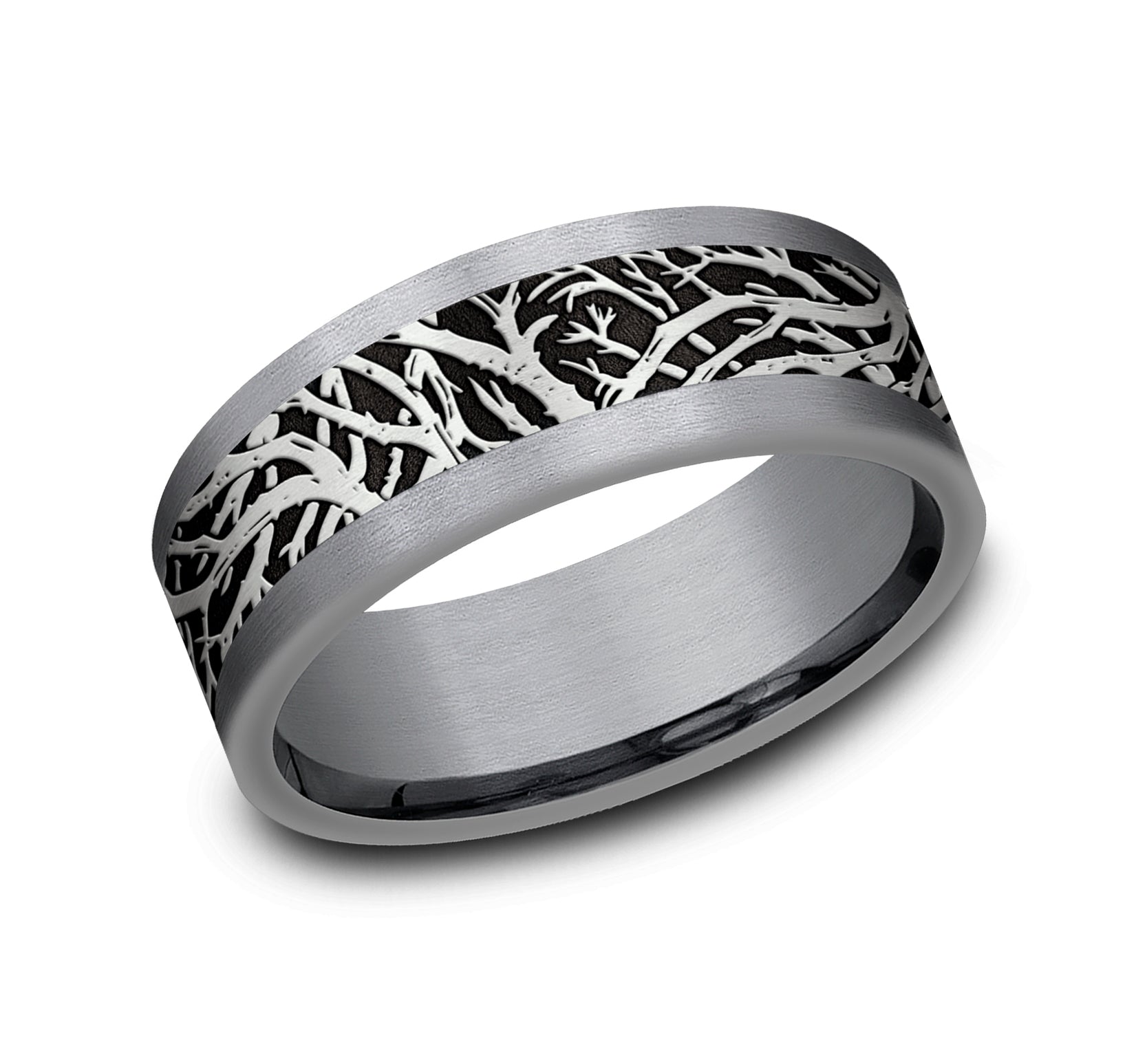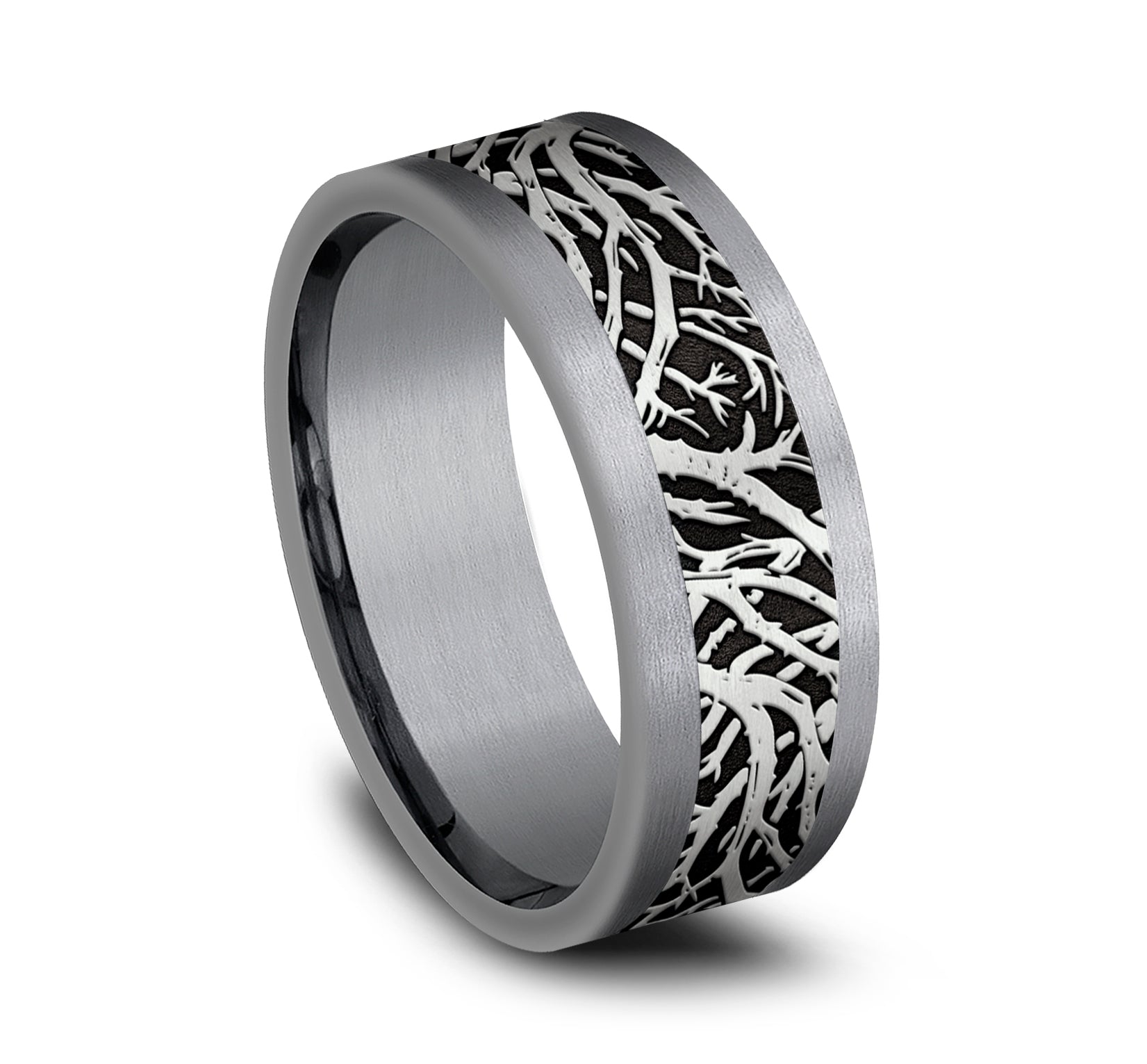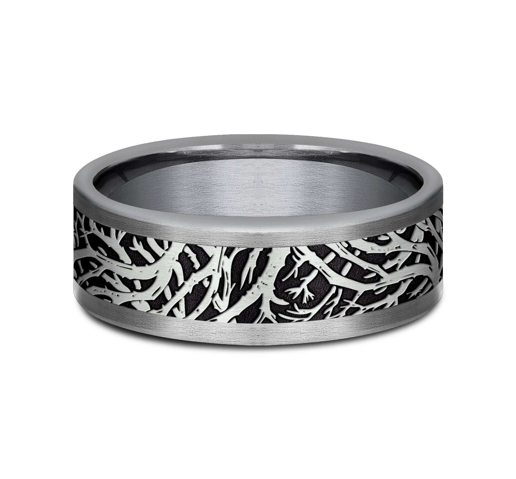 8mm, Comfort fit Grey Tantalum and Grey/Black Titanium Forest branch pattern, straight edges