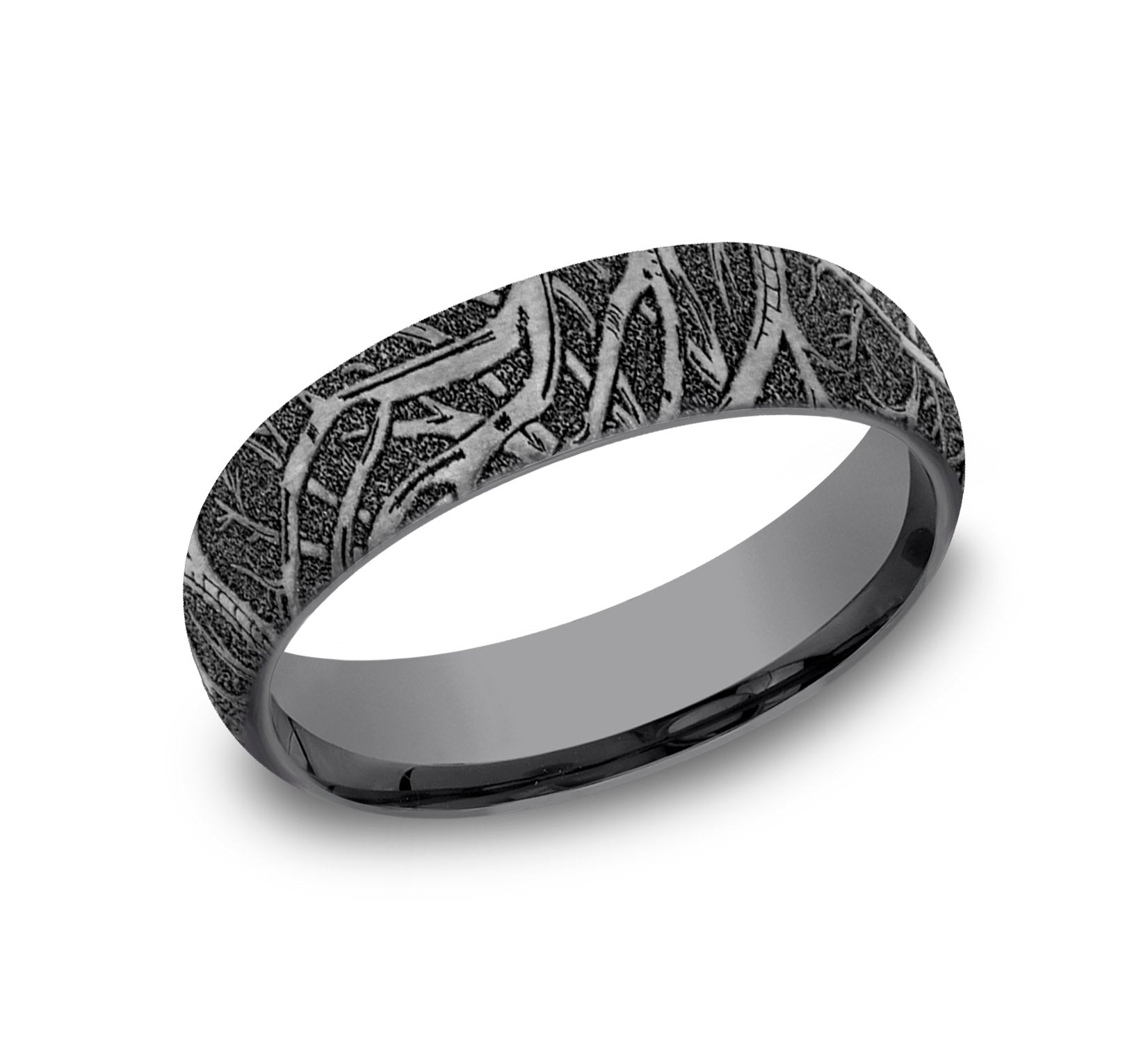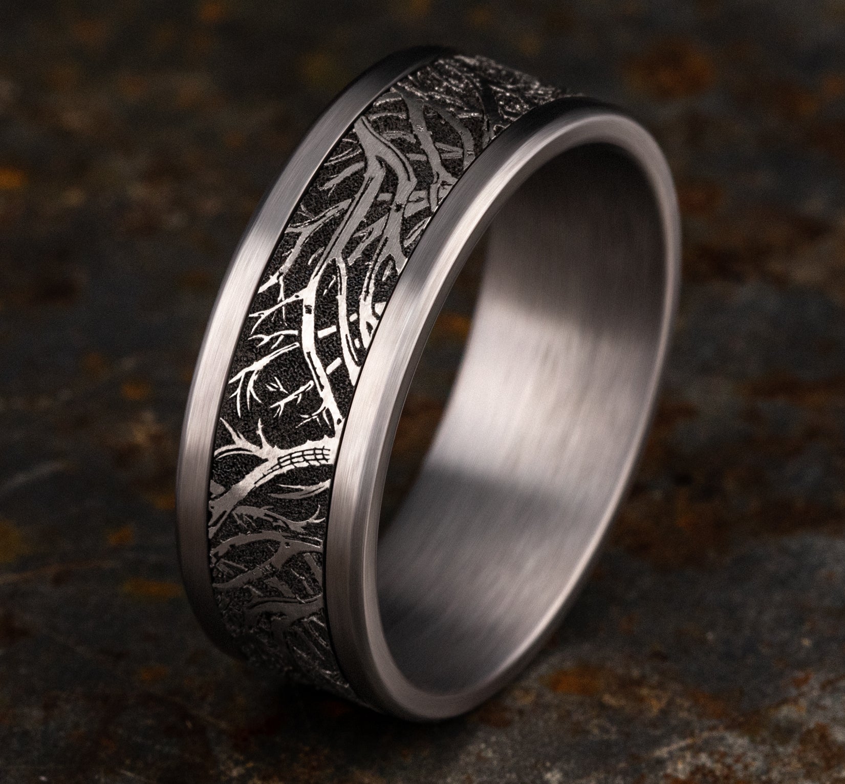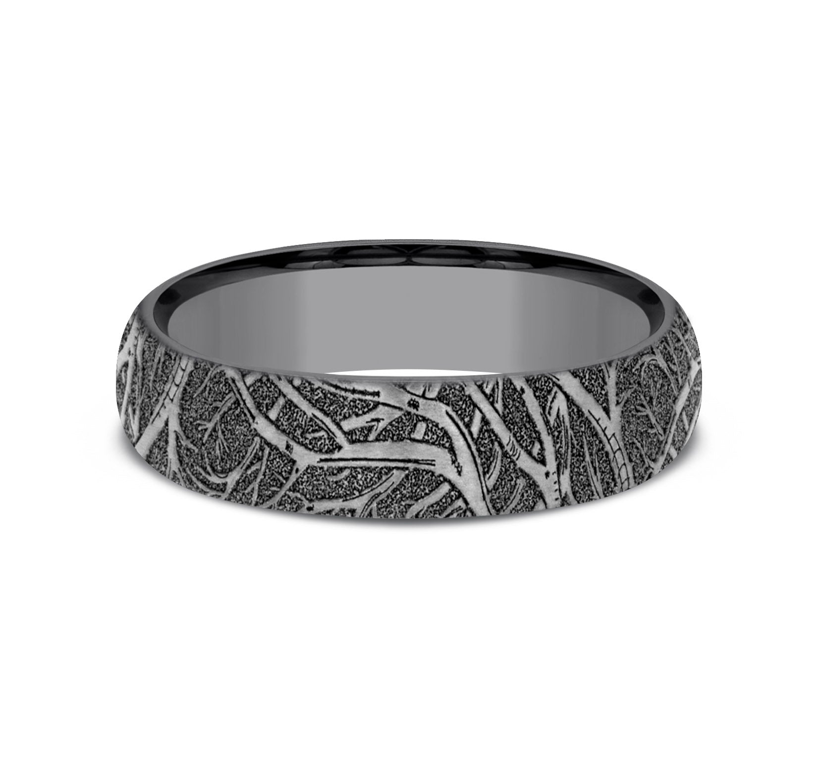 8mm, Comfort fit Grey Tantalum and Grey/Black Titanium Forest branch pattern, straight edges
